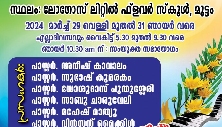 മുട്ടം: 29 മത് ലോഗോസ് ബൈബിൾ കൺവൻഷൻ മാർച്ച് 29 മുതൽ 31 വരെ മുട്ടം ലോഗോസ് ലിറ്റിൽ ഫ്ളവർ സ്കൂൾ വെച്ച് നടത്തപ്പെടും. പാസ്റ്റ്ർമാരായ അനീഷ് കാവാലം, സുഭാഷ് കുമരകം, യേശുദാസ് പുതുശ്ശേരി, സാബു ചാരുവേലി, മഹേഷ് മാത്യൂ, വിൻസെൻ്റ് മൈക്കൽ എന്നിവർ ദൈവവചനം പ്രഘോഷിക്കും. ലോഗോസ് സിങ്ങേഴ്സ് സംഗീത ശുശ്രൂഷ നിർവഹിക്കും. 31 ന് നടക്കുന്ന ആരാധനയോടെ കൺവെൻഷൻ സമാപിക്കും.