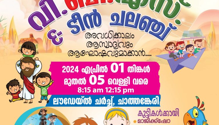 ചാത്തങ്കേരി: തിരുവല്ല വെസ്റ്റ് യുപിഎഫിന്റെ നേതൃത്വത്തിലുള്ള സംയുക്ത വിബിഎസും ടീൻ ചലഞ്ചും ഏപ്രിൽ 1 മുതൽ 5 വരെ രാവിലെ 8.15ന് ചാത്തങ്കേരി ലൗഡേയ്ൽ ചർച്ചിൽ നടക്കും. 31ന് (ഞായർ) 3.30ന് അധ്യാപക പരിശീലനം നടക്കും. എഐ ജനറേഷൻ എന്നതാണ് ചിന്താവിഷയം.