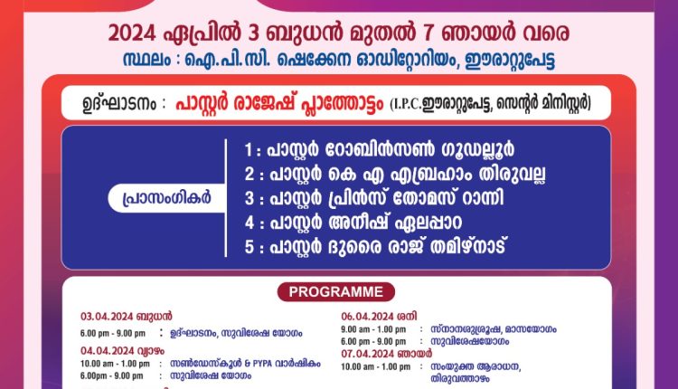 ഐ പി സി ഈരാറ്റുപേട്ട സെന്റർ കൺവെൻഷൻ ഏപ്രിൽ മൂന്ന് മുതൽ
