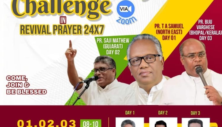 പുനലൂർ : എ.ജി. മലയാളം ഡിസ്ട്രിക്ട് പ്രയർ ഡിപ്പാർട്ട്മെൻ്റ് നേതൃത്വം നല്കുന്ന തുടർമാന ഓൺലൈൻ പ്രാർത്ഥനയായ റിവൈവൽ പ്രയറിൽ ഏപ്രിൽ 1 മുതൽ 3 വരെ മിഷൻ ചലഞ്ച് ക്രമീകരിച്ചിരിക്കുന്നു. ദിവസവും രാത്രി 8 മുതൽ 10 വരെ നടക്കുന്ന മീറ്റിംഗുകളിൽ പാസ്റ്റർമാരായ ടി.എ.ശാമുവേൽ (നോർത്തീസ്റ്റ് ഇന്ത്യ), സജി മാത്യു