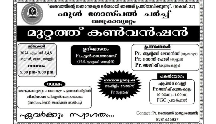 ഫുൾ ഗോസ്പൽ ചർച്ച്, മേലുകാവ് മറ്റം ഒരുക്കുന്ന മുറ്റത്ത് കൺവെൻഷൻ ഏപ്രിൽ 3,4,5 തീയതികളിൽ പാറമ്പുഴ, പുത്തൻവീട്ടിൽ ലിസിയാമ്മ പി.എൻ. സഹോദരിയുടെ ഭവനാങ്കണത്തിൽ വെച്ച് നടത്തപ്പെടുന്നു. പാസ്റ്റർ എൻ. ജെ. തോമസ് (FGC ഇടുക്കി സെന്റർ ) ഉത്ഘാടനം നിർവഹിക്കും. പ്രസംഗകരായ പാസ്റ്റർ ആന്റണി ലോറൻസ് (ആലപ്പുഴ), പാസ്റ്റർ ഡെന്നി പോൾ (തൃശ്ശൂർ), പാസ്റ്റർ അനീഷ് (കുന്നംകുളം) എന്നിവർ ദൈവവചനത്തിൽ നിന്നും സംസാരിക്കും. പാസ്റ്റർ സുഭാഷ് നയിക്കുന്ന തെഹില്ലീം വോയ്സ് ഗാനശുശ്രൂഷ നയിക്കും.