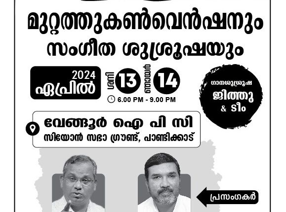 വേങ്ങൂർ ഐ പി സി സീയോൻ സഭയുടെയും പെരുമ്പാവൂർ സെന്റർ ഇവാഞ്ചലിസം ബോർഡിന്റെയും സംയുക്താഭിമുഖ്യത്തിൽ മുറ്റത്തു കൺവെൻഷനും സംഗീത ശുശ്രുഷയും 2024 ഏപ്രിൽ മാസം 13,14 ( ശനി, ഞായർ ) തീയതികളിൽ 6 PM മുതൽ 9 PM വരെ വേങ്ങൂർ ഐ പി സി സിയോൻ സഭാ ഗ്രൗണ്ട് പാണ്ടിക്കാട് വച്ച് നടത്തപ്പെടുന്നു.പാസ്റ്റർ ഷാജി എം പോൾ (പവർ വിഷൻ ), പാസ്റ്റർ എം എ തോമസ് (പെരുമ്പാവൂർ ഐ പി സി സെന്റർ മിനിസ്റ്റർ ) എന്നിവർ ദൈവവചനത്തിൽ നിന്നും സംസാരിക്കുന്നു.ബ്രദർ ജിത്തു ആൻഡ് ടീം ഒരുക്കുന്ന ഗാനശുശ്രുഷയും ഉണ്ടായിരിക്കും.