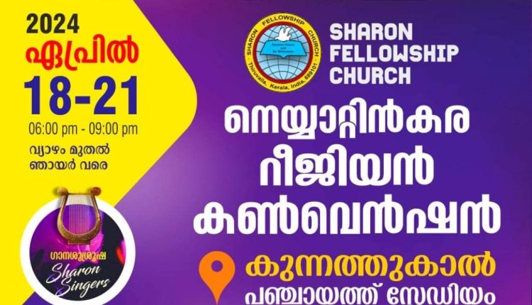 നെയ്യാറ്റിൻക്കര: ശാരോൻ ഫെലോഷിപ്പ് ചർച്ച് നെയ്യാറ്റിൻകര റീജിയൻ കൺവൻഷൻ ഏപ്രിൽ 18 മുതൽ 21 വരെ നടക്കും. കുന്നത്തുകാൽ പഞ്ചായത്ത് സ്റ്റേഡിയത്തിൽ വച്ചാണ് നടക്കുന്നത്.എല്ലാ ദിവസവും 6.30 മുതൽ 9.30 വരെ. പ്രസംഗകർ : പാസ്റ്റർമാരായ ഏബ്രഹാം ജോസഫ്, വി.ജെ. തോമസ്, ബി. മോനച്ചൻ, ബാബു ചെറിയാൻ, പോൾ ഗോപാലകൃഷ്ണൻ ,സാം റ്റി. മുഖത്തല, റ്റി. ക്രിസ്തുദാസ് എന്നിവരാണ്