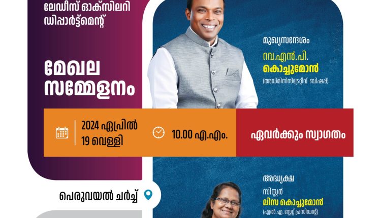 റാന്നി: ചർച്ച് ഓഫ് ഗോഡ് കേരള റീജിയൻ എൽ.എ ഡിപ്പാർട്ടുമെന്റിന്റെ ആഭിമുഖ്യത്തിൽ മേഖല ആദ്യ സമ്മേളനം ഏപ്രിൽ 19 ന് രാവിലെ 10 മുതൽ റാന്നി പെരുവയൽ ദൈവസഭാഹാളിൽ വെച്ച് നടക്കും. എൽ.എ.സംസ്ഥാന പ്രസിഡണ്ട് സിസ്റ്റർ.ലിസ കൊച്ചുമോൻ അദ്ധ്യക്ഷത വഹിക്കും. അഡ്മിനിസ്ട്രേറ്റീവ് ബിഷപ്പ് റവ.എൻ.പി.കൊച്ചുമോൻ മുഖ്യ സന്ദേശം നല്കും. പാസ്റ്റർ ഐസക്ക് ജോൺ ബൈബിൾ ക്ലാസ്സ് നയിക്കും.
