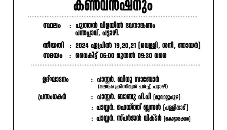 പട്ടാഴി:പട്ടാഴി മലങ്കര ക്രിസ്ത്യൻ ചർച്ചിന്റെയും കേരള സർക്കാർ എക്സൈസ് വിമുക്തി മിഷൻ സംയുക്തമായി നടത്തപ്പെടുന്ന സുവിശേഷ മഹായോഗവും ലഹരി വിരുദ്ധ ബോധവൽകരണ കൺവെൻഷനും ഇന്ന് മുതൽ ഞായറഴ്ച വരെ വൈകുനേരം 6 :00 മണി മുതൽ 9 :00 മണി വരെ പട്ടാഴി പന്തപ്ലാവിൽ ഉള്ള പുത്തൻ വിളയിൽ ഭവനാങ്കണത്തിൽ വച്ച് നടത്തപ്പെടുന്നു.പട്ടാഴി മലങ്കര ക്രിസ്ത്യൻ ചർച്ച് സഭ പാസ്റ്റർ പാസ്റ്റർ ബിനു സാബോർ പ്രാർത്ഥിച്ചു ആരംഭിക്കുന്ന മീറ്റിംഗിൽ പാസ്റ്റർ ബാബു പി. വി ,പാസ്റ്റർ ഫെയ്ത് ബ്ലെസ്സൺ പള്ളിപ്പാട്,പാസ്റ്റർ സ്പർജൻ വിക്ടർ എന്നിവർ ദൈവവചനം സംസാരിക്കുന്നു.എല്ലാവരെയും ദൈവനാമത്തിൽ ഇ മീറ്റിംഗിലേക്കു സ്വാഗതം ചെയ്യുന്നുവെന്ന് ഭാരവാഹികൾ അറിയിച്ചു.