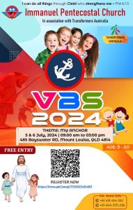 ഇമ്മാനുവൽ പെന്തക്കോസ്തൽ ചർച്ച് ടൗൺസ്വില്ലെ ഓസ്ട്രേലിയ : VBS ജൂലൈ 5,6 തീയതികളിൽ ട്രാൻസ്ഫോർമേഴ്സ് ഓസ്ട്രേലിയയുടെ നേതൃത്വത്തിൽ ടൗൺസ്വില്ലെ വച്ച് നടത്തപ്പെടുന്നു