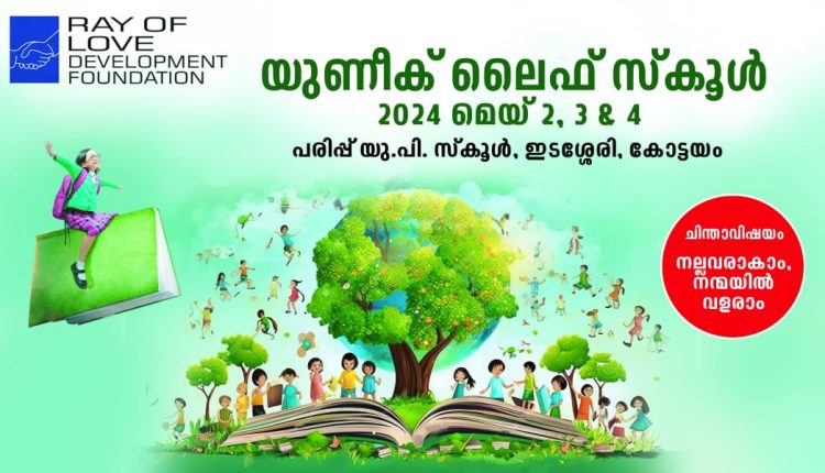 കോട്ടയം: റേ ഓഫ് ലൗ ഡവലപ്മെൻ്റ് ഫൗണ്ടേഷൻ്റെ ആഭിമുഖ്യത്തിൽ കോട്ടയം അയ്മനം പഞ്ചായത്തിലെ പരിപ്പ് യു.പി.സ്കൂളിൽ കുട്ടികൾക്കായി ലൈഫ് സ്കൂൾ സംഘടിപ്പിക്കുന്നു. മെയ് 2 വ്യാഴം മുതൽ 4 ശനി വരെ ദിവസവും രാവിലെ പത്ത് മുതൽ ഉച്ചകഴിഞ്ഞ് മൂന്ന് വരെയാണ് ലൈഫ് സ്കൂൾ നടക്കുന്നത്.