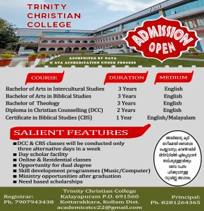 കലയപുരം: ട്രിനിറ്റി ക്രിസ്ത്യൻ കോളേജിൽ ദൈവവചന പഠനത്തോടപ്പം വിവിധ കോഴ്സുകളിലേക്കുള്ള അഡ്മിഷൻ ആരംഭിച്ചിരിക്കുന്നു. ജൂൺ 1 നു ക്ലാസുകൾ ആരംഭിക്കുന്നതാണ്. സഭ, സംഘടന വ്യത്യാസം കൂടാതെ ദൈവവചനം പഠിക്കുവാൻ തല്പരരായ വ്യക്തികളിൽ നിന്നും അപേക്ഷകൾ ക്ഷണിക്കുന്നു. ക്യാമ്പസിൽ താമസിച്ചും, ദിവസേന വന്നു പോയും പഠിക്കുവാനുള്ള സൗകര്യം ക്രമീകരിച്ചിരിക്കുന്നു. ദൈവ വചന പഠനത്തോടൊപ്പം, ഇതര നൈപുണ്യ അഭിവൃദ്ധി (Skill Development) ഉളവാക്കുന്ന പഠന കോഴ്സുകളും സജ്ജീകരിച്ചിരിക്കുന്നു. കൗൺസലിംഗ് ക്ലാസുകൾ, മലയാളം മീഡിയം ക്ലാസ്സുകൾ (online & offline) വിദ്യാർത്ഥികളുടെ സൗകര്യാർത്ഥം ആഴ്ചയിൽ മൂന്നു ദിവസം മാത്രം ഉണ്ടായിരിക്കുന്നതാണ്. ജോലിയോടുകൂടെ ഭാഗീകമായി ദൈവ വേല ചെയ്യുവാൻ ആഗ്രഹിക്കുന്നവർ, ഇടയ ശുശ്രൂഷ ചെയ്യുന്നവർ, സൺഡേ സ്കൂൾ അദ്ധ്യാപകർ, യുവ ജന പ്രവർത്തകർ, കൗൺസലിംഗ് മിനിസ്ട്രിയിൽ ഏർപ്പെടുവാൻ താല്പര്യപ്പെടുന്നവർ, പ്രായ ഭേദമെന്യേ ദൈവ വചനം പഠിക്കുവാൻ ആഗ്രഹിക്കുന്ന ഏവർക്കും സുവർണ്ണാവസരം. കൂടുതൽ വിവരങ്ങൾക്ക്: +91 7907943438; +91 6000974606