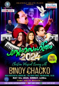 2024 മെയ് 12 ഞായറാഴ്ച വൈകുന്നേരം 6 മണിക്ക് ഇന്ത്യ പെന്തക്കോസ്ത് ചർച്ചിൽ വെച്ച് (INDIA PENTECOSTAL CHURCH INC, 7781 CRAIG STREET, PHILADELPHIA, 19136) നടക്കുന്നു. ബിനോയി ചാക്കോയോടോപ്പം സാംസൺ ഹെവൻലി ബീറ്റ്സും അബിയ മാത്യു, ഷെറിൻ, ജിൻസി, ഹെൽഡ മറ്റ് ഗായകരും അണിനിരക്കുന്നു. പ്രശസ്ത കീബോർഡിസ്റ്റ് വിജു ജേക്കബ് ഫിലഡൽഫിയ പശ്ചാത്തല സംഗീതം ഒരുക്കുന്നു. മ്യൂസിക്കൽ ഈവനിങ്ങിലേക്ക് എവരേയും സ്വാഗതം ചെയ്യുന്നതായി സംഘാടകർ അറിയിക്കുന്നു.