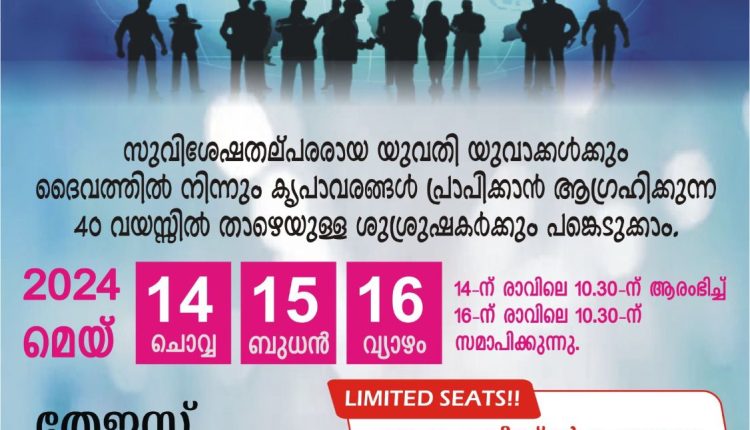 പുനലൂർ: ഡിസ്ട്രിക്ട് സി.എയുടെ നേതൃത്വത്തിൽ സുവിശേഷതല്പരരായ യുവതി യുവാക്കൾക്കായി മിഷൻ ചലഞ്ച് നടക്കും. മെയ്യ് 14 മുതൽ , 16 വരെ തിയതികളിൽ കുട്ടിക്കാനത്തുള്ള തേജസ് ക്യാമ്പ് സെൻ്ററിൽ നടക്കുന്ന മിഷൻ ചലഞ്ച് ഡിസ്ട്രിക്ട് സി.എ പ്രസിഡൻ്റ് പാസ്റ്റർ ജോസ് റ്റി ജോർജിൻ്റെ അദ്ധ്യക്ഷതയിൽ ഡിസ്ട്രിക്ട് സൂപ്രണ്ട് റവ. റ്റി.ജെ സാമുവൽ ഉദ്ഘാടനം ചെയ്യും. അനുഗ്രഹിതരായ ദൈവദാസൻ മാർ ശുശ്രുഷിക്കുകയും ചെയ്യും. ഈ മിഷൻ ചലഞ്ച് സുവിശേഷ വേലയ്ക്ക് താല്പര്യമുള്ള യുവതി യുവാക്കൾക്ക് അനുഗ്രഹമാകും. പ്രവേശനം സൗജന്യമാണ് ആദ്യം രജിസ്റ്റർ ചെയ്യുന്ന നൂറ് പേർക്ക് മാത്രമായിരിക്കും പ്രവേശനമെന്ന് സി.എ ഡിസ്ട്രിക്ട് ഭാരവാഹികൾ അറിയിച്ചു.