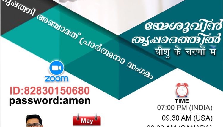 മസ്കറ്റ് : യേശുവിൻ തിരുപ്പാദത്തിൽ മിനിസ്ട്രിയുടെ പ്രാർത്ഥനാ സംഗമം മെയ് 11, ശനിയാഴ്ച നടക്കും. ഇന്ത്യൻ സമയം വൈകിട്ട് 7 മണി മുതൽ സൂം പ്ലാറ്റ്ഫോമിലൂടെയാണ് യോഗം സംഘടിപ്പിക്കുന്നത്. പാസ്റ്റർ. സോണി ചാക്കോ, യു. കെ ദൈവവചനം സംസാരിക്കും.