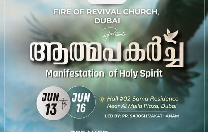 ദുബായ്: ഫയർ ഓഫ് റിവൈവൽ സഭയുടെ ആഭിമുഖ്യത്തിൽ 2010 മുതൽ നടന്നുവരുന്ന ആത്മപകർച്ച ഉണർവ് യോഗങ്ങൾ ഈ വർഷം ജൂൺ മാസത്തിൽ നടക്കുന്നതാണ്. 2024 ജൂൺ മാസം 13 വ്യാഴാഴ്ചയും, 14 വെള്ളിയാഴ്ചയും വൈകിട്ട് 7:30 മുതൽ സമാ റെസിഡൻസിയിലെ (അൽ മുല്ലാ പ്ലാസയ്ക്ക് സമീപം) ഹാൾ നമ്പർ 2 ൽ കൺവെൻഷൻ നടക്കും. 15ആം തീയതി ശനിയാഴ്ച രാവിലേ 9:30 മുതൽ രാത്രി 9:30 വരെ 12 മണിക്കൂർ തുടർമാനമായി പ്രാർത്ഥനയും ആരാധനയും സമാ റെസിഡൻസി (ഹാൾ നമ്പർ 2) ൽ വെച്ച് ഉണ്ടായിരിക്കുന്നതാണ്. 2024 ജൂൺ 16 ഞായറാഴ്ച ഉച്ചയ്ക്ക് 3:45 മുതൽ 6:30 വരെ നടക്കുന്ന പൊതു ആരാധന ഷാർജ യൂണിയൻ ചർച്ചിൽ മൂന്നാമത്തെ ഹാളിൽ വെച്ച് നടത്തപ്പെടുന്നു.