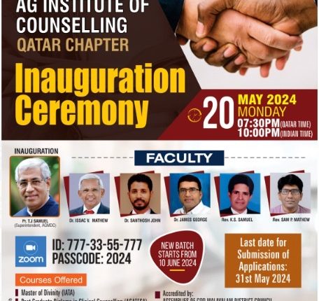 ദോഹ: അസംബ്ലീസ് ഓഫ് ഗോഡ് ഇൻസ്റ്റിറ്റ്യൂട്ട് ഓഫ് കൗൺസലിംഗിന്റെ നേതൃത്വത്തിൽ നടത്തപ്പെടുന്ന PGDCC (Post Graduate Diploma in Clinical Counselling) യുടെ 2024-2025 അധ്യയനവർഷത്തെ ബാച്ചിന്റെ ഉദ്ഘാടനം മെയ് 20 തിങ്കളാഴ്ച വൈകീട്ട് ഖത്തർ സമയം 07:30 നു (ഇന്ത്യൻ സമയം രാത്രി 10 ന്) സൂം പ്ലാറ്റ്ഫോമിലൂടെ നടക്കും. AG മലയാളം ഡിസ്ട്രിക്ട് സൂപ്രണ്ട് പാസ്റ്റർ ടി.ജെ സാമുവേൽ ഉദ്ഘാടനം ചെയ്യും.
