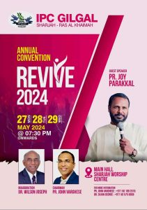 ഷാർജ്ജ : ഐപിസി ഗിൽഗാൽ ഷാർജ്ജ, റാസൽ ഖൈമ ചർച്ചിൻ്റെ ആഭിമുഖ്യത്തിൽ റിവൈവ് 2024- കൺവൻഷൻ നടത്തപ്പെടുന്നു.