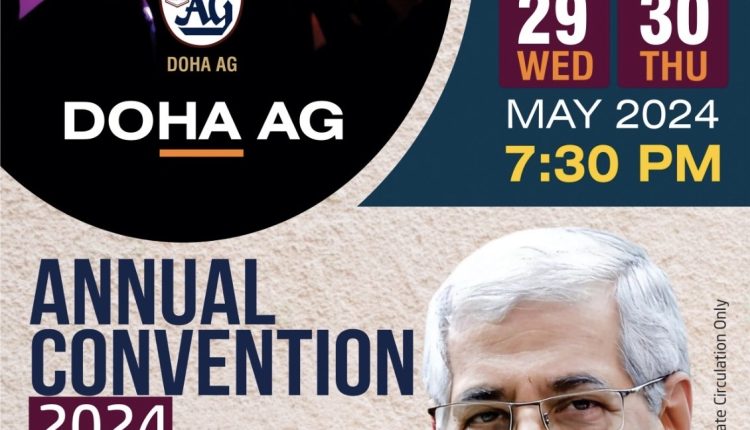 ദോഹ: ഖത്തറിലെ പ്രഥമ അസ്സംബ്ലീസ് ഓഫ് ഗോഡ് സഭയായ ദോഹ ഏജി സഭയുടെ വാർഷിക കൺവെൻഷൻ 2024 മെയ് 29, 30 തീയതികളിൽ റിലീജിയസ് കോംപ്ലെക്സിലുള്ള ദോഹ ഏജി സഭയിൽ വെച്ച് നടക്കും. അസംബ്ലീസ് ഓഫ് ഗോഡ് മലയാളം ഡിസ്ട്രിക്ട് സൂപ്രണ്ട് പാസ്റ്റർ ടി.ജെ സാമുവേൽ മുഖ്യസന്ദേശം നൽകും. പാസ്റ്റർ സജി പി അധ്യക്ഷത വഹിക്കും.