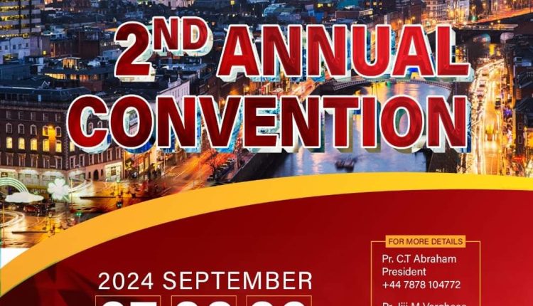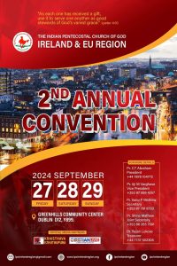 ഡബ്ലിൻ : ഐപിസി അയർലൻഡ് റീജിയൻ വാർഷിക കൺവെൻഷൻ 2024 സെപ്റ്റംബർ 27 മുതൽ 29 വരെ ഗ്രീൻ ഹിൽസ് കമ്മ്യൂണിറ്റി സെൻട്രൽ വെച്ച് നടക്കും. അനുഗ്രഹീതരായ ദൈവദാസന്മാർ ദൈവവചനം ശുശ്രൂഷയ്ക്കും.