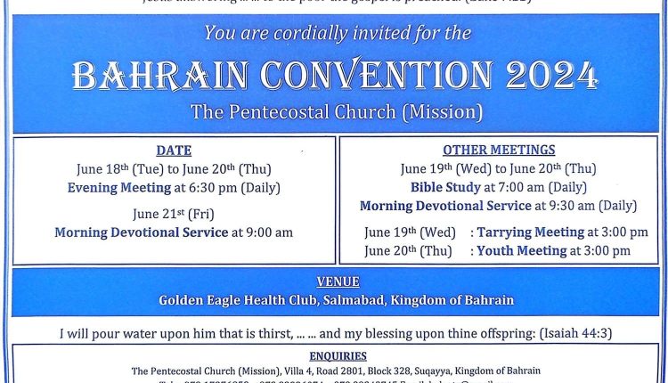ബഹ്റൈൻ: ദി പെന്തെക്കൊസ്ത് മിഷൻ ബഹ്റൈൻ കൺവൻഷൻ ജൂൺ 18 മുതൽ 21 വരെ സൽമാബാഡ് ഗോൾഡൻ ഈഗിൾ ഹെൽത്ത് ക്ലബ്ബിൽ വെച്ച് നടക്കും.