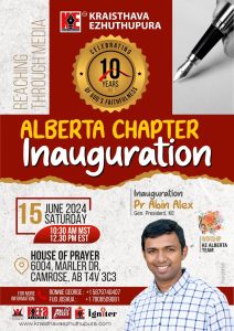 പ്രസിഡന്റ് പാസ്റ്റർ എബിൻ അലക്സ് ഉത്ഘാടനം നിർവ്വഹിക്കുന്നു. പ്രസ്തുത മീറ്റിങ്ങിൽ ക്രൈസ്തവ എഴുത്തുപുര ആൽബെർട്ട ചാപ്റ്റർ സംഗീത ശുശ്രൂഷയ്ക്ക് നേതൃത്വം നല്കുകയും ചെയ്യും.
