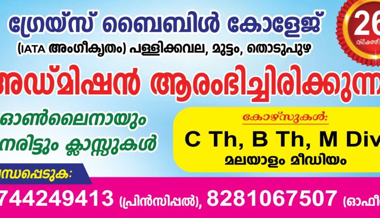 ഗ്രേസ് ബൈബിൾ ഇൻസ്റിറ്റ്യൂട്ട് – കോളജ് പ്രവർത്തനം 26 ാം വർഷത്തിലേക്ക്