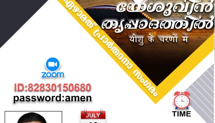 യേശുവിൻ തിരുപ്പാദത്തിൽ മിനിസ്ട്രിയുടെ 37)- മത് പ്രാർത്ഥനാ സംഗമം ജൂലൈ 13, ശനിയാഴ്ച നടക്കും. ഇന്ത്യൻ സമയം വൈകിട്ട് 7.30 മണി മുതൽ സൂം പ്ലാറ്റ്ഫോമിലൂടെയാണ് യോഗം സംഘടിപ്പിക്കുന്നത്. പാസ്റ്റർ. ഗ്ലാഡ്സൺ വർഗീസ് (യു എ ഇ ) ദൈവവചനം സംസാരിക്കും.