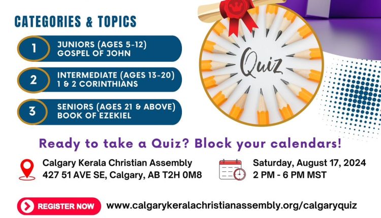 Calgary, Alberta: Calgary Kerala Christian Assembly (CKCA) is hosting a citywide quiz competition on Saturday August 17, 2024 from 2:00 PM to 6:00 PM at the CKCA Church Facility.