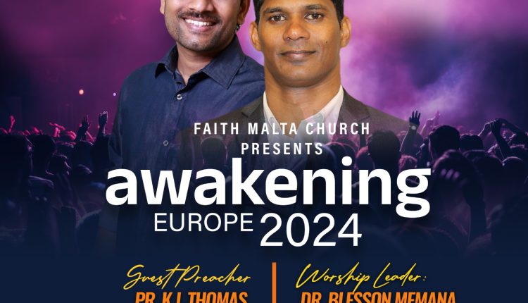 മാൾട്ടയിലെ പ്രഥമ പെന്തക്കോസ്ത് കൂട്ടായ്മയായ ഫെയ്ത്ത് മാൾട്ടയുടെ വാർഷിക കൺവെൻഷനും സുവിശേഷ മഹായോഗവും ” അവാകെനിങ് യൂറോപ്പ് 2024″ ഈ വരുന്ന ഓഗസ്റ്റ് 1മുതൽ 3 വരെ മാൾട്ട MCAST യൂണിവേഴ്സിറ്റി എൻജിനീയറിങ് ബ്ലോക്ക് , പൗളയിൽ വൈകിട്ട് 7.00 മുതൽ നടത്തപ്പെടുന്നു.പ്രസ്തുത മഹായോഗത്തിൽ പാ:കെ.ജെ തോമസ് കുമളി ദൈവവചനത്തിൽ നിന്ന് സംസാരിക്കുകയും ഡോ: ബ്ലെസ്സൻ മേമന സംഗീത ശുശ്രൂഷ കൾക്ക് നേതൃത്വം നൽകും.ഓഗസ്റ്റ് 4 ഞായറാഴ്ച സംയുക്ത ആരാധനയോടെ യോഗങ്ങൾ പര്യവസാനിക്കും.എല്ലാ ആത്മീയ കൂട്ടായ്മകൾക്കും പാസ്റ്റർ ബാബു വർഗീസ് നേതൃത്വംനൽകും .