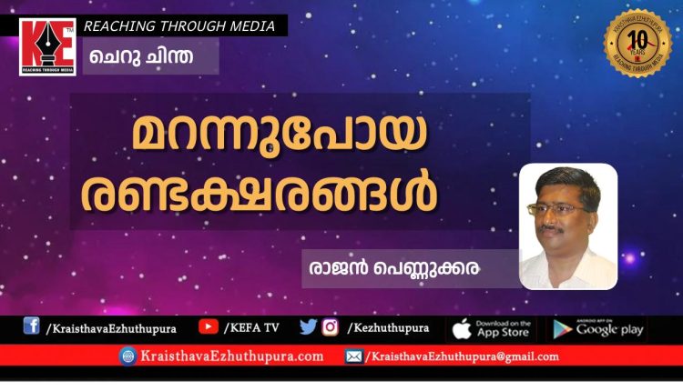 വചനം പഠിക്കുമ്പോൾ നിങ്ങൾ നന്ദികെട്ടവർ ആകാതെ നന്ദിയുള്ളവരായും ഇരിപ്പിൻ, നന്ദി പറയുന്നവരായിരിപ്പീൻ എന്നും കാൽക്കൽ കവിണ്ണു വീണു അവന്നു നന്ദി പറഞ്ഞു എന്നൊക്കെ വായിക്കുവാൻ കഴിയും. അപ്പോൾ മനുഷ്യൻ നന്ദികെട്ടവർ ആകാൻ സാധ്യതയുണ്ടെന്ന് വചനവും സംശയിക്കുന്നു, സാക്ഷ്യപ്പെടുത്തുന്നു. ആരുടെയും കാൽക്കൽ ഒന്നും വീഴണ്ട, പക്ഷെ ഒരു വാക്കിൽ എങ്കിലും “നന്ദി” ഉണ്ട്, എന്നോട് ക്ഷമിക്കണേ അഥവാ “സോറി” എന്നൊന്ന് പറയുവാൻ നാം ഇനിയും പഠിക്കുമോ. ഈ വാക്കുകൾ പറയാതെ പോയാൽ ജീവിതത്തിൽ അതൊരു തീരാകടം ആയി നമ്മേ നിരന്തരം വേട്ടയാടുമെന്ന സത്യം മറക്കരുത്. എപ്പോഴും കടത്തിന് പലിശയും കൂട്ടുപലിശയും ഉണ്ടെന്നും കടങ്ങൾ എഴുതി തള്ളുന്നതു വരെ അവകൾ തീരാബാധ്യത ആണെന്ന കാര്യം കൂടി ഓർത്തുകൊൾക.