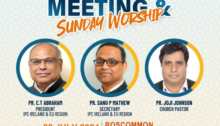 അയർലൻഡ്: ഇന്ത്യ പെന്തക്കോസ്ത് ദൈവസഭ അയർലൻഡ് & ഇ യു റീജിയന്റെ കൗണ്ടി റോസ്കോമണിലുള്ള പുതിയ പ്രവർത്തനമായ ഐപിസി ഗ്ലോബൽ പ്രയർ സെന്റർ കൂട്ടായ്മയുടെ പ്രവർത്തന ഉദ്ഘാടനം 2024 ജൂലൈ 28 ന് രാവിലെ 11 മണി മുതൽ ഉച്ചയ്ക്ക് 1.30 വരെ റോസ് കോമണിലുള്ള കമ്മ്യൂണിറ്റി സ്പോർട്സ് പാർക്കിൽ വച്ച് നടക്കുന്നു. ഐ പി സി അയർലൻഡ് & ഇ യു