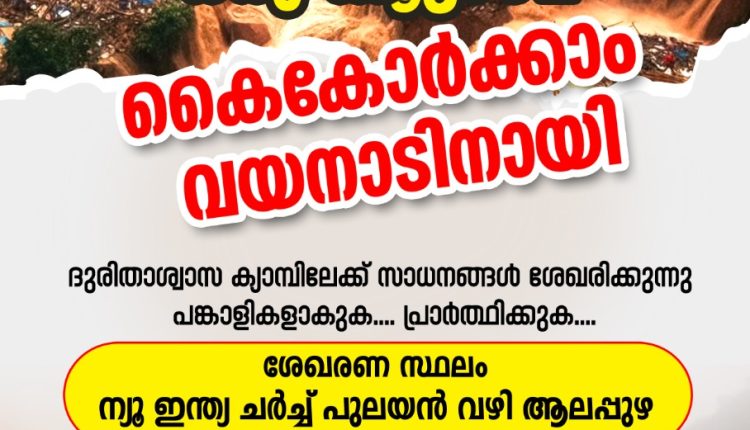 ആലപ്പുഴ : ആലപ്പുഴയിലെ സംയുക്ത പെന്തകോസ്ത് കൂട്ടാഴ്മ യായ എൻഡ് ടൈം റെവൈവൽ മൂവ്മെന്റ്ന്റെ നേതൃത്വതിൽ വയനാട് ദുരിതശ്വസ ക്യാമ്പുകളിലേക്കു സാധനങ്ങൾ ശേഖരിക്കുന്നു. ശേഖര സ്ഥലം ന്യൂ ഇന്ത്യ പ്രയ്സ്സ് ചാപ്പൽ ആലപ്പുഴ ടൗൺ കൂടുതൽ വിവരങ്ങൾക്ക്