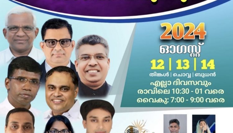 തൃശൂർ – ഹോളി തെയോളോജിക്കൽ കോളേജിന്റെ ആഭിമുഖ്യത്തിൽ സൂമിൽ നടത്തപെടുന്ന ത്രിദിന സുവിശേഷ യോഗവും സംഗീതവിരുന്നും ആഗസ്ത് 12 തിങ്കൾ മുതൽ 14 ബുധൻ വരെ ഇന്ത്യൻ സമയം രാവിലെ 10 -1 മണി വരെയും രാത്രി 7—9 വരെയും നടത്തപ്പെടുന്നു . പാസ്റ്റർ പ്രിൻസ് റാന്നി പാസ്റ്റർ അനിൽ കൊടിത്തോട്ടം പാസ്റ്റർ വീയപുരം ജോർജ്കുട്ടി പാസ്റ്റർ ഷിജു വർഗീസ് സിസ്റ്റർ ഷെറിൻ ഷിബു ബ്രദർ സെൽമോൻ സോളമൻ എന്നിവർ ദൈവവചനത്തിൽ നിന്നും സംസാരിക്കുന്നു . കൃപ വോയിസ് , പാസ്റ്റർ സ്റ്റാൻലി , സിസ്റ്റർ ജിറ്റി ജോൺ കോട്ടയം എന്നിവർ സംഗീത ശുശ്രൂഷയും നിർവഹിക്കുന്നു . പാസ്റ്റർ ഷിബു വർഗീസ് ശുശ്രുഷകളക്ക് നേത്വത്വം നൽകും.