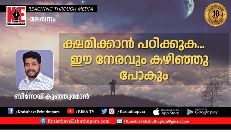 പ്രിയരേ ക്ഷമ എന്ന വാക്ക് രണ്ടക്ഷരം മാത്രമേ ഉള്ളൂ എങ്കിലും ഇതിന്റെ വില വളരെ വലുതാണ്. എന്നുവെച്ചാൽ നിത്യതയിൽ പ്രവേശിക്കുന്നതിന് തടസ്സമായി ക്ഷമ ഇല്ലാത്തവരായി തീരരുത് എന്നർത്ഥം, ക്ഷമ പ്രാപിച്ചവരായി എല്ലാറ്റിനേയും ക്ഷമയോടെ നേരിട്ടാൽ മാത്രമേ നമ്മൾക്ക് സ്വർഗ്ഗത്തിൽ എത്തിച്ചേരുവാൻ കഴിയുള്ളൂ.ക്ഷമിക്കുവാൻ നമുക്ക് ചില സമയത്ത് കഴിയാതെ വരും എന്നാൽ കർത്താവായ യേശുക്രിസ്തു പഠിപ്പിച്ചത് ക്ഷമിക്കുവാനാണ് ” കർത്താവേ നീ നല്ലവനും ക്ഷമിക്കുന്നവനും നിന്നോട് അപേക്ഷിക്കുന്നവരുടെ ഒക്കെ മഹാദയാലുമാകുന്നു(സങ്കീർത്തനം 86:5) കർത്താവ് നമ്മോട് ക്ഷമിച്ചത് പോലെ നാമും അന്യോന്യം ക്ഷമിപ്പിൻ. ചിലപ്പോൾ നമുക്ക് ക്ഷമ ചോദിക്കുവാൻ സമയം കിട്ടിയില്ലെന്ന് വരാം. എപ്പോഴാണ് നമ്മുടെ മരണം എന്ന് നാം അറിയുന്നില്ല രാത്രിയിൽ ഉറങ്ങുന്നവർ രാവിലെ ഉണരുന്നില്ല. എത്രയെത്രയോ സംഭവങ്ങൾ ഈ ദിവസങ്ങളിൽ നാം തെളിവായി കാണുന്നു. ഞെട്ടിപ്പിക്കുന്ന പ്രകൃതി ദുരന്തങ്ങൾ, അപകട മരണങ്ങൾ, പകർച്ചവ്യാധികൾ, രോഗങ്ങൾ. നമ്മുടെ ഈ നല്ല സമയവും കടന്നു പോകും നല്ല ആരോഗ്യം ക്ഷയിച്ചു പോകും. നമ്മുടെ ജീവിതത്തിൽ നാം ക്ഷമിക്കാൻ പഠിക്കുക.. നമ്മുടെ സഹോദരങ്ങളോട് നാം ക്ഷമിക്കുക. ദൈവവചന ഇപ്രകാരം പറഞ്ഞിരിക്കുന്നു” നിങ്ങൾ ഓരോരുത്തൻ സഹോദരനോട് ഹൃദയപൂർവ്വം ക്ഷമിക്കാഞാൽ സ്വർഗ്ഗസ്ഥനായ എന്റെ പിതാവും അങ്ങനെ തന്നെ നിങ്ങളോട് ചെയ്യും (മത്തായി 18:35) നമ്മൾ ക്ഷമിക്കാൻ നമ്മുടെ നിത്യത നഷ്ടപ്പെടുവാൻ നമ്മൾ അനുവദിക്കരുത്.ഒരുപക്ഷേ തെറ്റ് മറ്റുള്ളവരുടെ ഭാഗത്തായിരിക്കാം, അവർ നമ്മളെ ഒരുപാട് മാനസികമായി വേദനിപ്പിച്ചിട്ടുണ്ടാകാം മനസ്സ് തകർത്തിടുണ്ടകാം സാരമില്ലെന്ന് നാം അവരോട് ഒരു സോറി അല്ലെങ്കിൽ എന്നോട് ക്ഷമിക്കുക എന്ന ഒരു വാക്ക് പറഞ്ഞാൽ മതി. അതുകൊണ്ട് നമ്മൾ ചിലപ്പോൾ മോശക്കാരായിരിക്കാം തെറ്റുകാർ ആയിരിക്കാം സാരമില്ല നമ്മുടെ നിത്യത നഷ്ടമാവില്ലല്ലോ. ക്ഷമ ചോദിക്കുവാൻ നമ്മൾ ധൈര്യം കാണിക്കുക ചിലപ്പോൾ ഇനി ക്ഷമ ചോദിക്കാൻ സമയം കിട്ടിയില്ലെന്നു വരാം, ക്ഷമ ചോദിക്കുവാൻ സമയം കണ്ടെത്തുക, അത് നമ്മുടെ ആയുസ്സ് ലഭിക്കുന്ന ഒരു നല്ല സമയമാണ്. വിശുദ്ധ ബൈബിളിൽ ഇപ്രകാരം പറഞ്ഞിരിക്കുന്നു” നിങ്ങൾ മനുഷ്യരോട് അവരുടെ പിഴകളെ ക്ഷെമിച്ചാൽ സ്വർഗ്ഗസ്ഥനായ നിങ്ങളുടെ പിതാവ് നിങ്ങളോട് ക്ഷമിക്കും, നിങ്ങൾ മനുഷ്യരോട് പിഴകളെ ക്ഷമിക്കാനാലോ നിങ്ങളുടെ പിതാവ് നിങ്ങളുടെ പിഴകളെയും ക്ഷമിക്കുകയില്ല ( മത്തായി 6:14.15) നമ്മുടെ ഈ ലോകത്തെ ജീവിതം എപ്പോൾ തീരും എന്ന് നാം അറിയുന്നില്ല മരണം എപ്പോളാണെന്ന് അറിയാകകൊണ്ട് ക്ഷമ ചോദിക്കാതെ കടന്നുപോകാൻ ഇടയാകരുത്. നമ്മുടെ ജീവിതത്തിൽ ക്ഷമ ഇല്ലാതെ വരുമ്പോഴാണ് മനസ്സിൽ വാശിയും വൈരാഗവും വെറുപ്പും കൂടുന