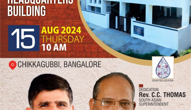 ബെംഗളൂരു: ചർച്ച് ഓഫ് ഗോഡ് കർണാടക സ്റ്റേറ്റ് പുതിയതായി പണികഴിപ്പിച്ച ആസ്ഥാന മന്ദിരം സമർപ്പണ ശുശ്രൂഷ ആഗസറ്റ് 15 രാവിലെ 10ന് കൊത്തന്നൂർ ചിക്കഗുബ്ബി മാർത്തോമാ സെൻ്ററിന് സമീപം നടക്കും.