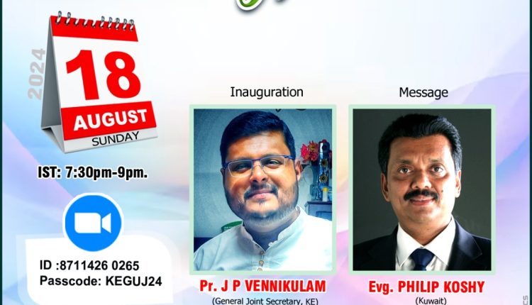 2024 – 25 വർഷത്തെ പ്രവർത്തന ഉദ്ഘാടനം നാളെ (ഓഗസ്റ്റ് 18) ഞായറാഴ്ച വൈകിട്ട് 7:30 മുതൽ 9 വരെ സൂമിലൂടെ നടക്കും. പാസ്റ്റർ ജെ പി വെണ്ണിക്കുളം (ക്രൈസ്തവ എഴുത്തുപുര ജനറൽ ജോയിന്റ് സെക്രട്ടറി) ഉദ്ഘാടനം ചെയ്യും. ഇവാ. ഫിലിപ്പ് കോശി (കുവൈറ്റ്) മുഖ്യ സന്ദേശം നൽകും. ഷിജു ഫിലിപ്പ് ആൻഡ് ടീം സംഗീത ശുശ്രൂഷ നിർവഹിക്കും. തങ്കച്ചൻ ജോൺ ( ഗുജറാത്ത് ചാപ്റ്റർ പ്രസിഡന്റ് ) ഈ യോഗത്തിന് അധ്യക്ഷത വഹിക്കും.