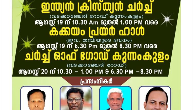 കുന്നംകുളം: യുണൈറ്റഡ് പെന്തെക്കോസ്തു ഫെല്ലോഷിപ്പിൻ്റെ അഭിമുഖ്യത്തിൽ 2024 ആഗസ്റ്റ് 19,20(തിങ്കൾ, ചൊവ്വ) ദിവസങ്ങളിൽ ധ്യാന യോഗങ്ങൾ നടക്കും.19 ന് രാവിലെ ഇന്ത്യൻ ക്രിസ്ത്യൻ ചർച്ചിൽ വെച്ചും വൈകീട്ട് കക്കയം പ്രയർ ഹാളിൽ വെച്ചും 20ന് രാവിലെയും വൈകീട്ടും വടക്കാഞ്ചേരി റോഡിലൂള്ള ചർച്ച് ഓഫ് ഗോഡ് ഹാളിൽ വെച്ചുമാണ് യോഗങ്ങൾ നടക്കുന്നത്. പ്രസ്തുത യോഗങ്ങളിൽ പാസ്റ്റർ പി.കെ മധു, പാസ്റ്റർ ഇ.ജി ജോസ്, പാസ്റ്റർ കെ.ജെ തോമസ്, ഡോ.സാജൻ സി.ജേക്കബ് എന്നിവർ ദൈവവചനം ശിശ്രൂഷിക്കും. ജനറൽ സെക്രട്ടറി പാസ്റ്റർ അനിൽ തിമോത്തി, സെക്രട്ടറി പാസ്റ്റർ പി.ജെ ജോണി, പ്രോഗ്രാം കൺവീനർ പാസ്റ്റർ സുരേഷ് എടക്കളത്തൂർ എന്നിവർ നേതൃത്വം നൽകും.