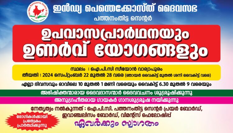 ഐ.പി.സി പത്തനംതിട്ട സെന്റർ പ്രയർ ബോർഡ് & ഇവാഞ്ചലിസം ബോർഡും സെൻ്റർ വുമൻസ് ഫെലോഷിപ്പും ചേർന്ന് ഉപവാസ പ്രാർത്ഥനയും ഉണർവ് യോഗങ്ങളും നടത്തപ്പെടുന്നു. അഭിഷിക്തന്മാരായ ദൈവദാസന്മാർ ദൈവവചനം ശുശ്രൂഷിക്കുകയും അനുഗ്രഹീതരായ ഗായകർ ഗാനശുശ്രൂഷ നയിക്കും ചെയ്യുന്നു.