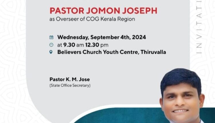ചർച്ച് ഓഫ് ഗോഡ് കേരളാ റിജീയൻ ഓവർസീയറായി പാസ്റ്റർ ജോമോൻ ജോസഫ് നാളെ ചുമതല ഏൽക്കും