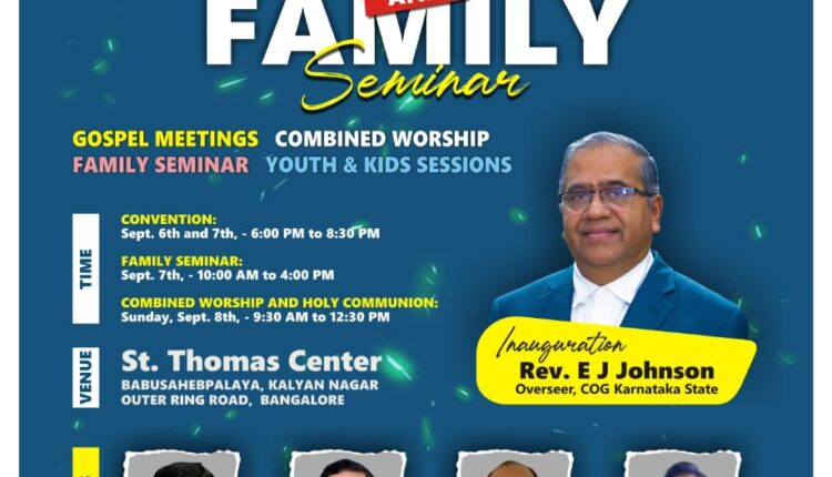 ബെംഗളൂരു: ചർച്ച് ഓഫ് ഗോഡ് കർണ്ണാടക സ്റ്റേറ്റ് ബെംഗളൂരു സെൻട്രൽ ഡിസ്ട്രിക്ട് കണവൻഷനും ഫാമിലി സെമിനാറും സെപ്റ്റംബർ 6 ന് ബാബുസാഹേബ് പാളയ, കല്ല്യാൺ നഗറിലുള്ള സെന്റ് തോമസ് സെന്ററിൽ വെച്ച് സുവിശേഷ യോഗത്തോടെ ആരംഭിക്കുകയും, തുടർന്ന് 7 ന് കുടുംബ സെമിനാറും, കുട്ടികൾക്കും യൗവ്വനക്കാർക്കായും ഉള്ള പ്രത്യേക സെഷനുകളും, ഞായറാഴ്ച തിരുമേശയോട് ചേർന്ന് സംയുക്ത ആരാധനയും, ഉണ്ടായിരിക്കുന്നതാണ്.