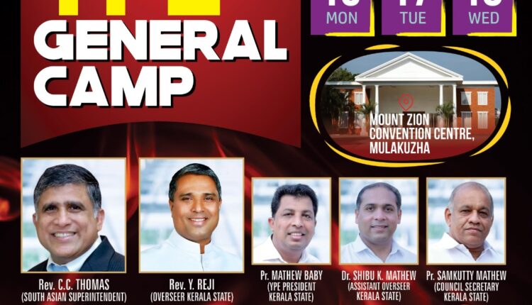 മുളക്കുഴ: ചർച്ച് ഓഫ് ഗോഡ് ഇൻ ഇന്ത്യ കേരള സ്റ്റേറ്റ് വൈ.പി.ഇ ജനറൽ ക്യാമ്പ് നാളെ മുതൽ 18 വരെ മുളക്കുഴ മൗണ്ട് സിയോൺ കൺവെൻഷൻ സെന്ററിൽ വെച്ച് നടക്കും.16ന് സ്റ്റേറ്റ് ഓവർസിയർ റവ.വൈ റെജി ക്യാമ്പ് ഉദ്ഘാടനം ചെയ്യും. വൈ പി ഇ സ്റ്റേറ്റ് പ്രസിഡൻറ് പാസ്റ്റർ മാത്യു ബേബി അധ്യക്ഷത വഹിക്കും.
