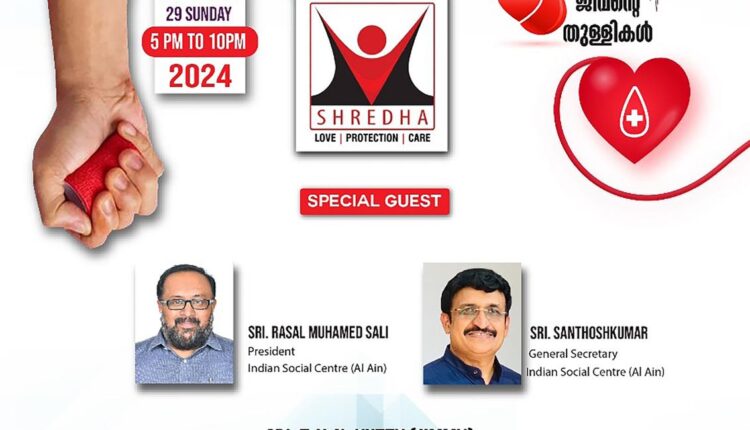 ശ്രദ്ധ യൂ.എ.ഇ ചാപ്റ്ററിന്റെ ആഭിമുഖ്യത്തിൽ രക്ത ദാന ക്യാമ്പ് സംഘടിപ്പിക്കുന്നു