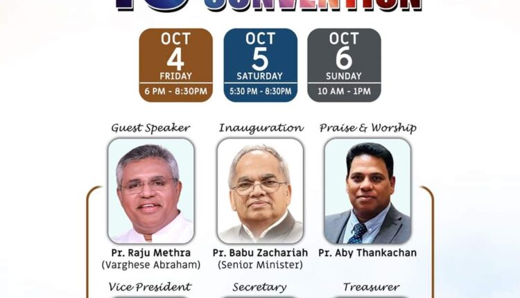 വെള്ളി വൈകുന്നേരം 6 മണി മുതൽ -8:30 വരെയും 5 ശനിയാഴ്ച വൈകുന്നേരം 5:30 മുതൽ 8:30 വരെയും 6 ഞായറാഴ്ച രാവിലെ 10 മണി മുതൽ 1 മണി വരെയും നടക്കും. പാസ്റ്റർ രാജു മേത്രയിൽ ദൈവവചനത്തിൽ നിന്നും സംസാരിക്കും. പാസ്റ്റർ ബാബു സക്കറിയ ഉദ്ഘാടനം നിർവഹിക്കും.പാസ്റ്റർ എബി തങ്കച്ചൻ ആരാധനയ്ക്ക് നേതൃത്വം നൽകും. പാസ്റ്റർ ഡാനിയൽ കെ,. സാജു മാത്യു ,സോൾ വർഗീസ് എന്നിവർ നേതൃത്വം നൽകും.