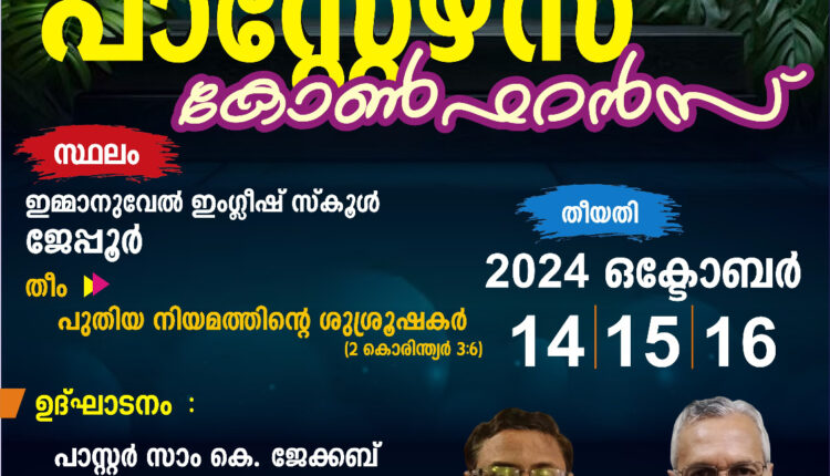 ഛത്തീസ്ഗഡ്: ശാരോൻ ഫെലോഷിപ്പ് ഒഡിഷ-ഛത്തീസ്ഗഡ് റീജിയൻ പാസ്റ്റേഴ്സ് കോൺഫറൻസ് ഒക്ടോബർ 14 തിങ്കൾ മുതൽ 16 ബുധൻ വരെ ജയ്പൂർ ഇമ്മാനുവേൽ ഇംഗ്ലീഷ് സ്കൂളിൽ വച്ച് നടക്കും.