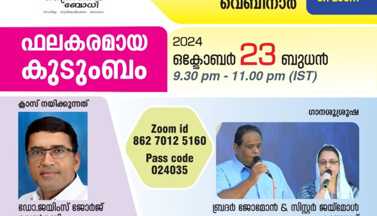 ഒക്ടോബർ 23 ബുധൻ ഇന്ത്യൻ സമയം രാത്രി 9.30 മുതൽ 11 വരെ സൂം പ്ലാറ്റ്ഫോമിൽ നടക്കും. പുനലൂർ ബഥേൽ ബൈബിൾ കോളേജ് പ്രിൻസിപ്പലും ക്രൈസ്തവബോധി വൈസ് പ്രസിഡൻ്റും പ്രമുഖ ക്രിസ്ത്യൻ കൗൺസലറുമായ ഡോ.ജെയിംസ് ജോർജ് വെൺമണി ക്ലാസ് നയിക്കും. ജോമോനും ജയ്മോളും ഗാനശുശ്രുഷ നയിക്കും. ഫലകരമായ കുടുംബം എന്നതാണ്ചിന്താവിഷയം.