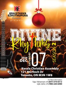ടൊറോന്റോ: ക്രൈസ്തവ എഴുത്തുപുര ഒന്റാരിയ ചാപ്റ്ററിന്റെ നേതൃത്വത്തിൽ ഒരുക്കുന്ന ഡിവൈൻ റിഥം സീസൺ 2 ടൊറോന്റോ കേരള ക്രിസ്ത്യൻ അസംബ്ലിയിൽ (KCA Church) വെച്ച് ഡിസംബർ ഏഴിന് നടത്തപ്പെടും. ഒന്റാറിയോയിലെ വിവിധ സഭകൾ ഈ മ്യൂസിക് കോൺസർട്ട് കോമ്പറ്റീഷനിൽ പങ്കെടുക്കുന്നതാണ്. ആദ്യം രജിസ്റ്റർ ചെയ്യുന്ന 10 സഭകൾക്കാണ് പങ്കെടുക്കാൻ അവസരം ലഭിക്കുന്നത്.