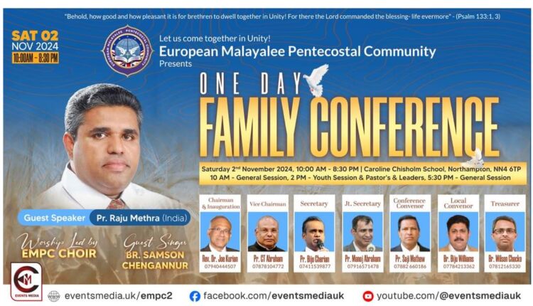നോർത്താംപ്ട് : യുറോപ്പ്യൻ മലയാളി പെന്തക്കോസ്ത് കമ്മ്യൂണിറ്റി (ഇ എം പി സി ) ഏക ദിന സമ്മേളനം നവംബർ 2 ശനിയാഴ്ച്ച , നോർത്താംപ്ടനിൽ നടത്തപ്പെടുന്നു. ഇ എം പി സി ചെയർമാൻ റവ. ഡോ . ജോ കുര്യൻ മീറ്റിംഗ് പ്രാർത്ഥിച്ച് ഉൽഘാടനം ചെയ്യുന്ന മീറ്റിംഗിൽ പാസ്റ്റർ രാജു മേത്ര മുഖ്യ പ്രഭാഷകൻ ആയിരിക്കും. യുവജങ്ങൾക്കായുള്ള പ്രത്യേക സെഷൻ പാസ്റ്റർ വർഗീസ് എം ശാമുവേൽ നയിക്കും. ഇ എം പി സി ഗായക സംഘം ഗാന ശുശ്രൂഷയ്ക്ക് നേതൃത്വം നൽകും.