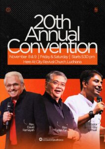 ലുധിയാന: ലുധിയാനയിലെ പ്രമുഖ പെന്തെക്കോസ്ത് സഭകളിൽ ഒന്നായ ലുധിയാന സിറ്റി റിവൈവൽ ചർച്ച് 20 വർഷം പൂർത്തിയാകുന്നു. ഇതോടനുബന്ധിച്ച് വാർഷിക കൺവെൻഷനും സ്തോത്ര ശുശ്രൂഷയും 2024 നവംബർ 8, 9 തീയതികളിൽ നടക്കും.
