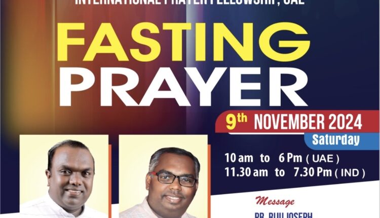 ഷാർജ : പ്രാർത്ഥനാസംഗമം (International Prayer Fellowship ) ഒരുക്കുന്ന ഉപവാസ പ്രാർത്ഥന നാളെ( നവംബർ 9 ശനിയാഴ്ച )രാവിലെ 10 മണി മുതൽ രാത്രി 6 മണി വരെ (യു. എ. ഇ സമയം ) നടക്കും. പാസ്റ്റർ റിജു ജോസഫ് , പാസ്റ്റർ ജോയ് ചീനക്കൽ എന്നിവർ ദൈവ വചനം ശ്രുശൂഷിക്കുകയും പാസ്റ്റർ ബിനു ജോസഫ് ,പാസ്റ്റർ മാത്യു പി. സി, ബ്രദർ ബിനോയ് ലൂക്കാസ് എന്നിവർ ആരാധനക്ക് നേതൃത്വം നൽകും. രാജ്യങ്ങൾക്ക് വേണ്ടിയും ( Pray for Nations ) മറ്റുള്ളവരെ വിഷയങ്ങൾക്ക് വേണ്ടിയും ഉള്ള പ്രാർത്ഥനകൾക്ക് പാസ്റ്റർ കെ. പി. ജോസ് വേങ്ങൂർ നേതൃത്വം നൽകും. Zoom മീറ്റിംഗ് ID 332 242 5551 Paascode: 2020
