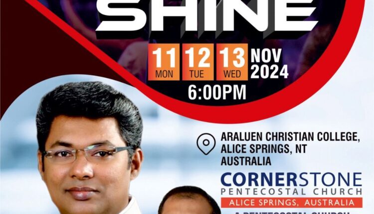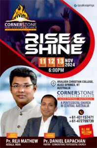 ഓസ്ട്രേലിയ: ഓസ്ട്രേലിയയിലെ ആലീസ് സ്പ്രിംഗ്സിലുള്ള കോർണർസ്റ്റോൺ പെന്തക്കോസ്തൽ ചർച്ചിന്റെ ആഭിമുഖ്യത്തിൽ റൈസ് & ഷൈൻ കോൺഫറൻസ് നവംബർ 11 മുതൽ 13 വരെ അരലുവൻ ക്രിസ്ത്യൻ കോളേജിൽ നടക്കും. ദിവസവും വൈകിട്ട് ആറിന് ആരംഭിക്കുന്ന സമ്മേളനങ്ങളിൽ പാസ്റ്റർ റെജി മാത്യു മുഖ്യ പ്രഭാഷണം നടത്തും. സഭയുടെ ലീഡ് പാസ്റ്റർ ഡാനിയേൽ ഈപ്പച്ചൻ ശുശ്രൂഷകൾക്ക് നേതൃത്വം നൽകും. പാസ്റ്റർ ജെറി ഫിലിപ്പിന്റെ നേതൃത്വത്തിൽ ചർച്ച് ക്വയർ ഗാനങ്ങൾ ആലപിക്കും.
