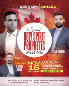 കാനഡ : കാനഡ എൽ-ഷദ്ദായി ജീസസ് എലൈവ് വർഷിപ് സെന്റർ ചർച്ച് ഒരുക്കുന്ന ആത്മീയ സമ്മേളനം നവംബർ16 ന് രാവിലെ 10:30 ന് LONDON