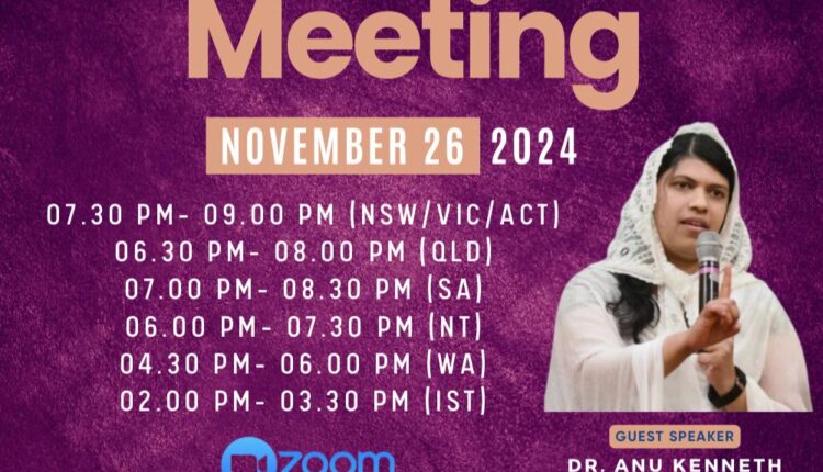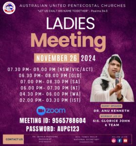 Australia: Australian United Pentecostal Churches (AUPC) is excited to announce the upcoming Ladies Meeting, scheduled for Tuesday, November 26, 2024. This meeting promises to be a time of spiritual enrichment and fellowship.
