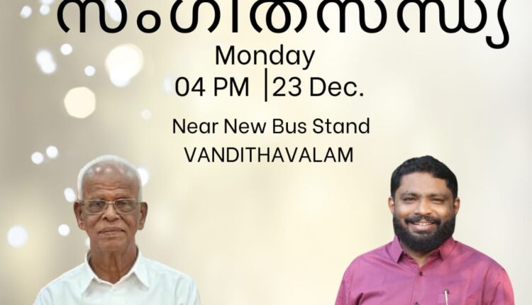 പാലക്കാട്: ഐപിസി കാർമ്മൽ വണ്ടിത്താവളം സഭയുടെ ആഭിമുഖ്യത്തിൽ ക്രിസ്തുമസ് സംഗീത സന്ധ്യ ഡിസംബർ 23 ന്